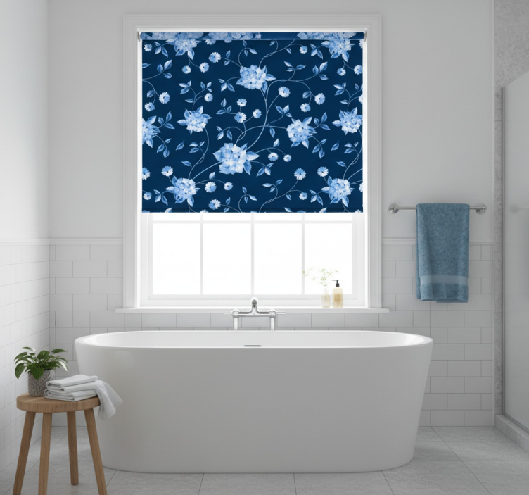 デザインは、深いネイビーの背景に対して、精巧な青い花と繊細な葉を特徴としています。デイジーを含むさまざまな花々が優雅に絡み合い、エレガントな印象を与えています。茎の流れるような曲線が調和の感覚を高め、どんな空間も変える穏やかで inviting な美学を生み出しています。