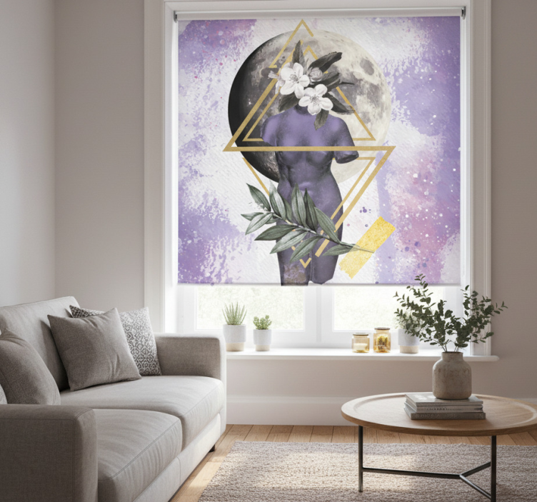 人のシルエットが繊細な花々と鮮やかな葉で飾られた魅力的なデザイン。背後には、幾何学的な形に囲まれた満月がその光を放っている。背景は紫の色合いが混ざり合い、自然と抽象的な形が調和する天体の雰囲気を醸し出している。