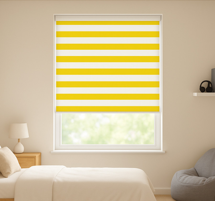 参考: E5880ブラインド テンネージャールーム 黄色と白のストライプは、明るく楽しい雰囲気を演出するために設計されています。カラフルなストライプデザインが特徴で、どんな部屋にもフィットします。2回のクリックで簡単に組み立てられ、掃除も簡単です。直射日光から部屋を保護し、下げるとプライバシーが確保されます。お客様は、必要な光の量とプライバシーに応じて、3つの異なるテクスチャから選択できるローラーブラインドを購入できます。