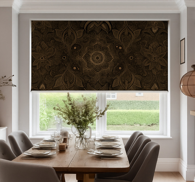 ダイニングルーム ブラインド ダイニングルーム ブラインド ブラックとゴールドのマンダラは、室内の装飾に最適です。美しいデザインは、どんなインテリアにもマッチし、空間に個性を与えます。さらに、機能的な特徴を持つこのブラインドは、実用性と美しさを兼ね備えています!