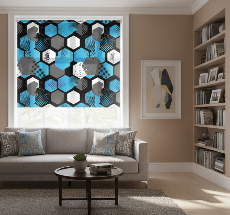 魅力的なパターンは、さまざまな青、灰色、黒の色合いの相互に絡み合った六角形の形状で構成されています。このデザインは、点状のテクスチャやエネルギッシュなスプラッシュなどの要素を取り入れ、動きと深みを感じさせます。現代的な装飾に最適で、都会的な美学と洗練さを融合させています。