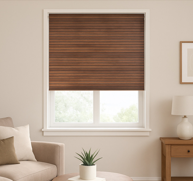 豊かな木のような質感を持つこのデザインは、温かみのある茶色の均一な横線を特徴としています。クリーンでモダンな美学が視覚的な魅力を高め、さまざまな環境に適しています。多用途な追加要素として、洗練されたタッチを提供しながら、光のコントロールとプライバシーを確保します。