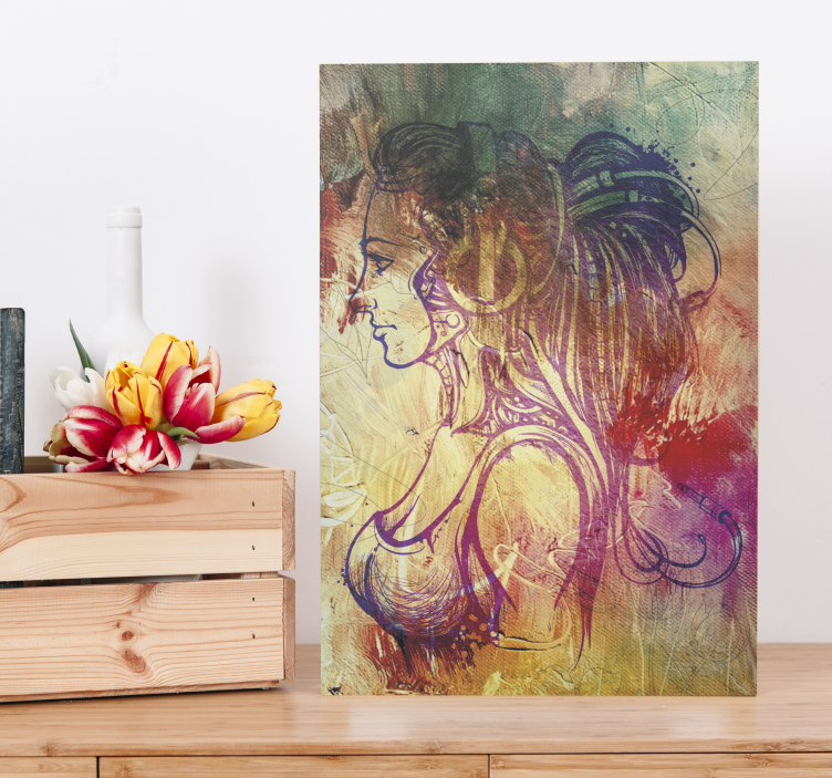 参考: Q6417テクスチャーのある背景に繊細に描かれた、流れる髪を持つ女性の魅力的なプロファイルシルエット。このデザインは女性らしさの本質を捉え、詳細な線画と鮮やかな色のスプラッシュを融合させ、芸術性と表現の調和を生み出しています。