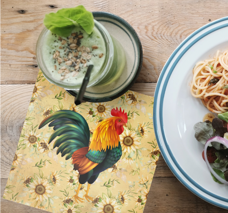 鮮やかな雄鶏がひまわりの背景の中央に配置されており、活気ある農場をテーマにしたモチーフを作り出しています。雄鶏の詳細な羽毛は色のスペクトルを示し、その視覚的魅力を高めています。このデザインは、素朴な魅力と自然の美しさの本質を捉えています。
