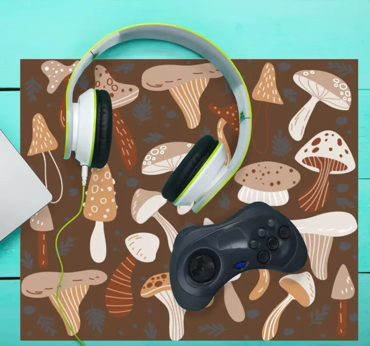 このデザインは、茶色の背景に、漫画ベージュ、茶色、白の漫画のキノコが素晴らしいパターンで描かれています。