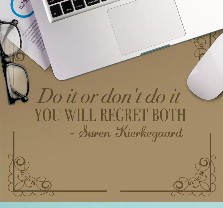 デザインには、行動を取るかどうかに関わらず後悔が避けられないことを強調するSøren Kierkegaardの力強い引用が含まれています。エレガントなタイポグラフィのプレゼンテーションは装飾的な要素に囲まれており、インスピレーションを与えるステートメントピースとなっています。