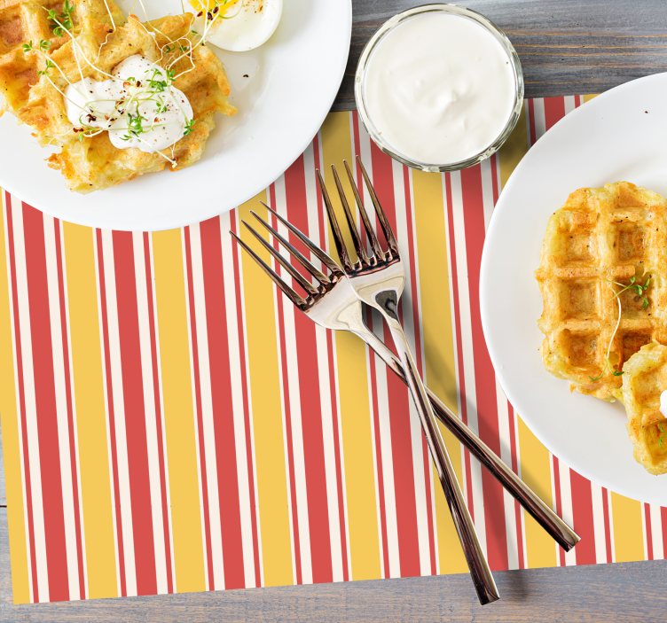 明るくカラフルなストライプ模様で、黄色、赤、白のラインが特徴です。この楽しいデザインは、子供の集まりやカジュアルな家族の食事にぴったりで、活気ある色合いでダイニング体験を引き立てます。