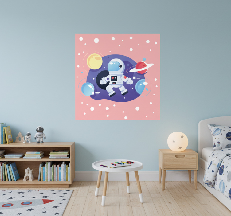 この鮮やかなイラストは、楽しい宇宙のシーンで浮かんでいる陽気な宇宙飛行士を描いています。キャラクターの周りには、カラフルな惑星やバブル、星が柔らかいピンクの背景の中に広がっています。この遊び心あふれるデザインは、冒険と驚きの感覚を呼び起こし、子供部屋や教育スペースに最適です。