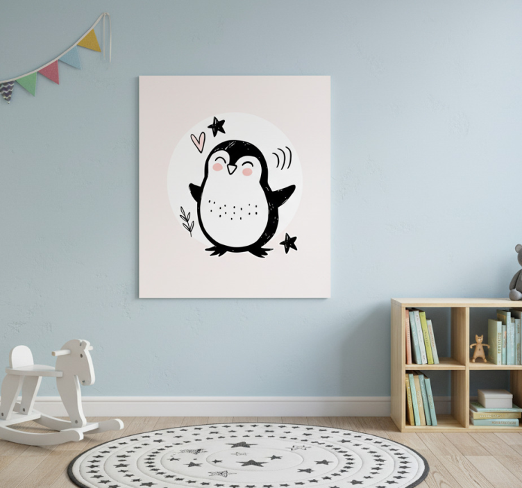 この whimsical イラストには、シンプルな白と黒で飾られた陽気なペンギンが描かれており、楽しそうな表情をしています。キャラクターの周りには、ハートや星などの遊び心あふれる要素が散りばめられています。背景は柔らかい色合いで、魅力的な雰囲気を高めており、子供部屋の装飾や遊び心のあるアートワークにぴったりです。