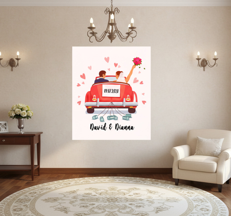 この魅力的なイラストは、鮮やかな赤い車の中で結婚式を楽しむカップルを描いています。花嫁はブーケを持ち、花婿は笑顔で、周りには浮かぶピンクのハートがあります。特別な日を強調する09.07.2020という日付が目立っており、愛と幸福の雰囲気を醸し出しています。 ポスター 祭事とイベント 新婚カップル