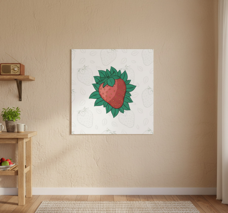 この鮮やかなイラストは、大きなカートゥーンスタイルのストロベリーが豊かな緑の葉に囲まれている様子を描いています。アートワークは、淡いアウトラインの小さなストロベリーや葉があしらわれた明るい背景に中心を置いています。暖かい色合いと遊び心のあるデザインが、どんな空間にも新鮮さを加えるのにぴったりな、招待するような明るい雰囲気を作り出しています。 ポスター 厨房 鮮やかでジューシーなイチゴと緑の葉