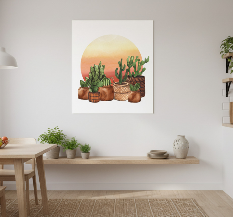 この鮮やかなアートワークは、柔らかなグラデーションの夕焼けを背景に、魅力的な鉢に配置されたさまざまなサボテンや多肉植物を特徴としています。テラコッタのアーストーンと容器の自然な質感が爽やかな緑を引き立て、ホームデコレーション愛好者にぴったりの温かく魅力的な雰囲気を作り出しています。 ポスター 厨房 サークルの中の夕日のあるサボテン