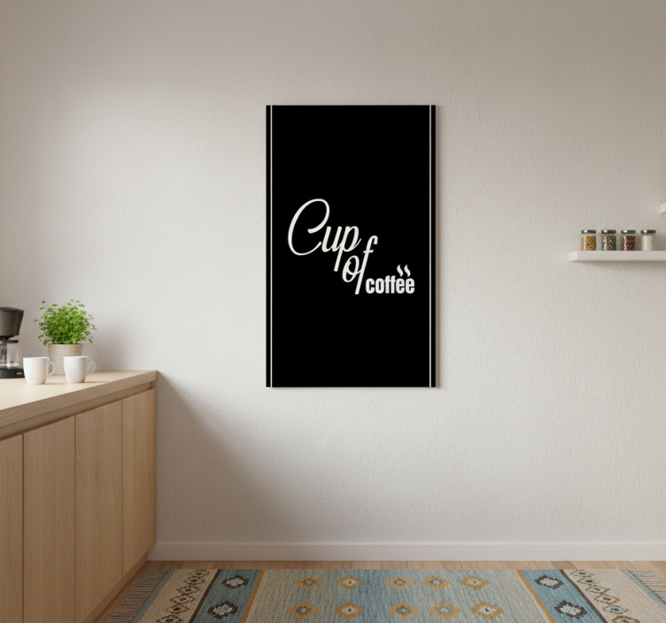 この画像には、エレガントなフォントで「Cup of coffee」というフレーズを強調したスタイリッシュな壁アートが描かれています。黒い背景が太字の白い文字を引き立て、印象的な視覚的コントラストを生み出しています。周囲の要素には、コージーな雰囲気を醸し出す小さな植物や器具で飾られた木製のキッチンカウンターが含まれています。