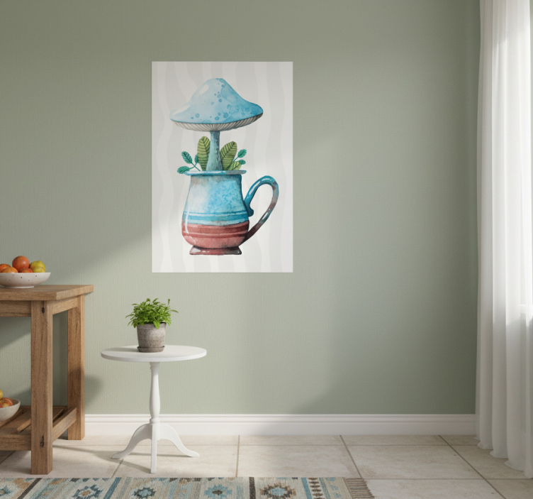 この whimsical なアートワークは、色とりどりのピッチャーから現れる青いキノコと、豊かな緑の葉に飾られています。柔らかな水彩スタイルが穏やかな雰囲気を生み出し、ホームデコールにぴったりです。アーストーンと遊び心のあるデザインが創造性を呼び起こし、どんな空間でも魅力的な焦点となります。 ポスター 厨房 カップのかわいいキノコデザイン