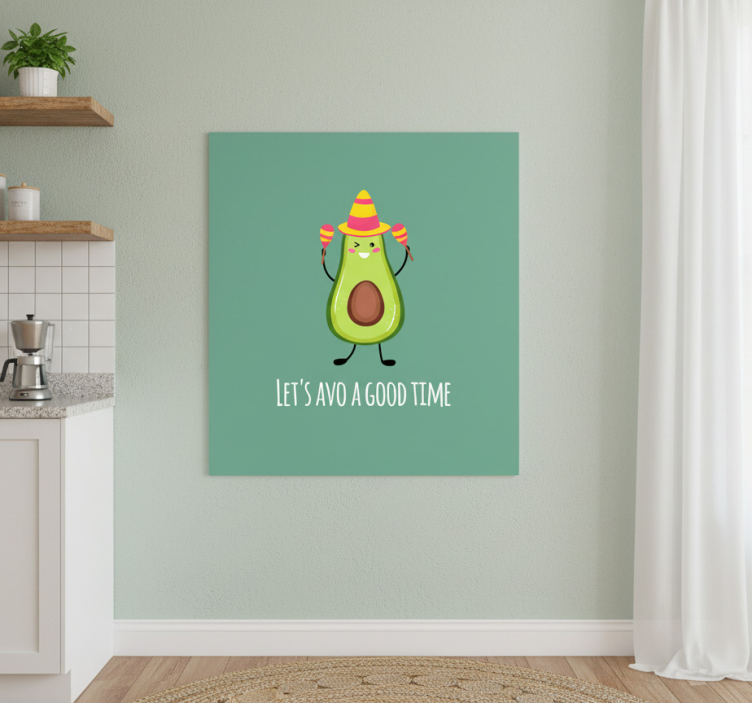 この鮮やかなアートワークは、カラフルな帽子をかぶった陽気なアボカドキャラクターを描いています。遊び心あふれるデザインは喜びを放ち、'LET'S AVO A GOOD TIME'というフレーズが添えられています。落ち着いた緑の背景に設定されており、このイラストはキッチンの装飾にぴったりで、楽しく活気ある雰囲気を促進します。 ポスター 厨房 アボカドの面白い名言