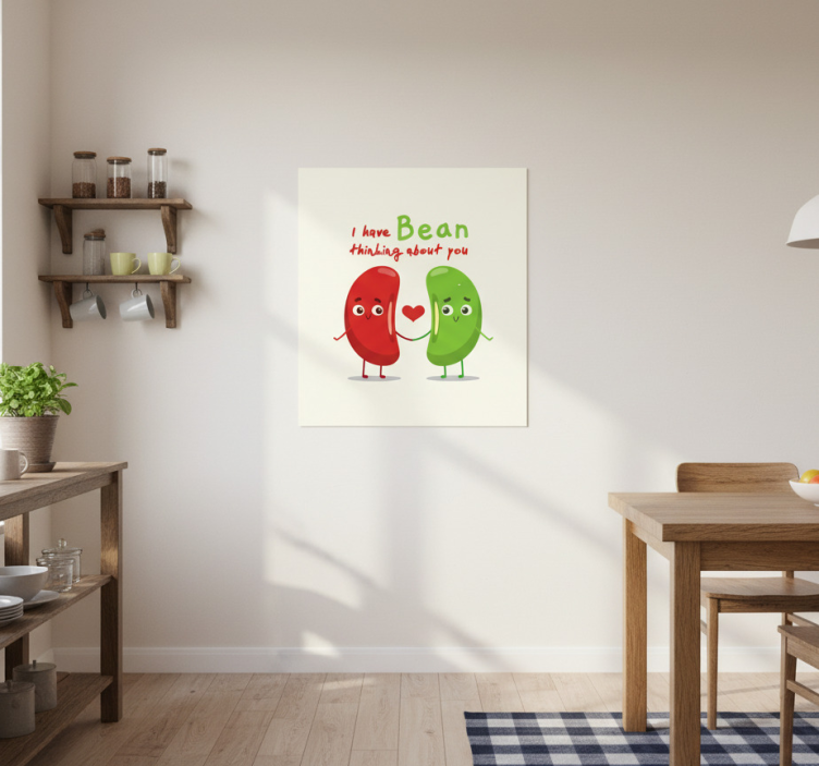 この魅力的なイラストには、手をつないだ赤い豆と緑の豆のペアが描かれています。遊び心あふれるキャラクターたちは、温かさと愛情を感じさせる雰囲気を醸し出しており、ウィットに富んだフレーズ 'I have Bean thinking about you.' がそれを引き立てています。明るい背景が鮮やかな色を引き立て、心地よいシーンを作り出しています。 ポスター 厨房 豆に関する面白い名言