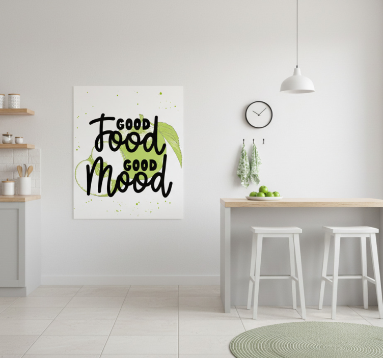 この画像は、スタイリッシュなウォールアートを強調したミニマリストキッチンのシーンを特徴としています。アートワークは、エレガントなフォントで「Good Food Good Mood」というフレーズを際立たせ、緑の色合いと葉のイラストで装飾されています。クリーンスペースには、木製のカウンタートップ、バースツール、装飾的な緑の要素が含まれ、爽やかな雰囲気を演出しています。 ポスター 厨房 緑の果物の面白い名言