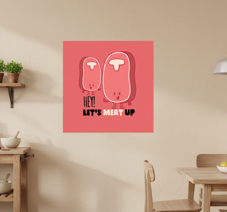 この活気に満ちたイラストは、鮮やかなピンクの背景に対してアニメーションされた二つの肉のカットを描いています。友好的な顔と遊び心満載の表情で、彼らは「HEY! LET'S MEAT UP.」というフレーズで観客を招きます。このユーモラスなデザインは、料理文化とユーモアを組み合わせており、料理愛好家にぴったりの魅力的なビジュアルを作り出しています。 ポスター 厨房 肉に関する面白い名言