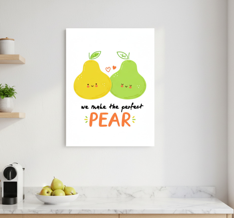 この魅力的なイラストには、黄色と緑の2つの愛らしい梨が描かれており、どちらも楽しげな表情をしています。白い背景に対して、遊び心のあるアートワークは「we make the perfect PEAR」というフレーズでアクセントを加え、 whimsicalな雰囲気を演出しています。ホームデコレーションに最適なこのデザインは、温かさと愛情を呼び起こします。 ポスター 厨房 梨の面白い名言