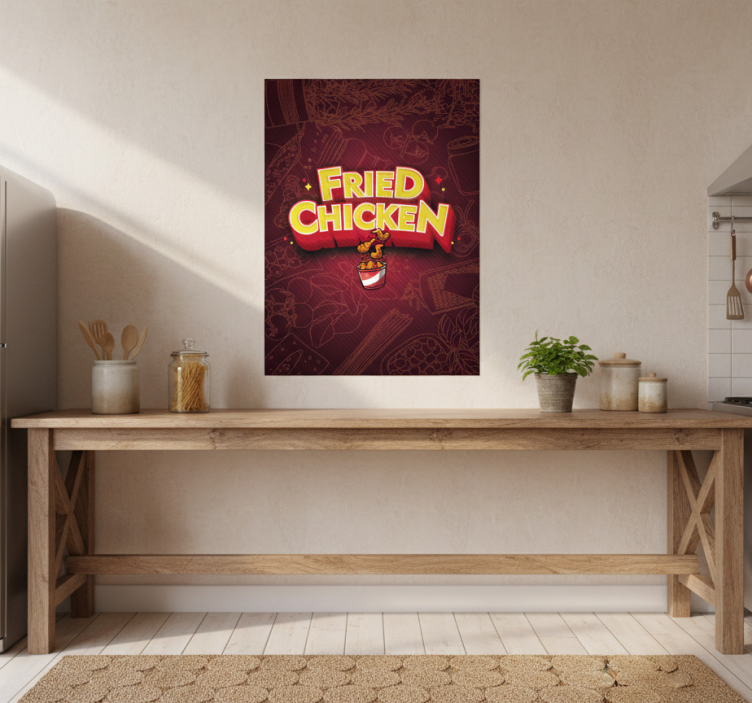 この鮮やかな画像は、「Fried Chicken」の遊び心あふれる表現を、大胆なタイポグラフィで描いています。背景は温かみのある色合いで豊かで、視覚的な魅力を高めています。食べ物の要素のグラフィックが主題をさりげなく補完し、食の愛好家にぴったりの魅力的な雰囲気を作り出しています。