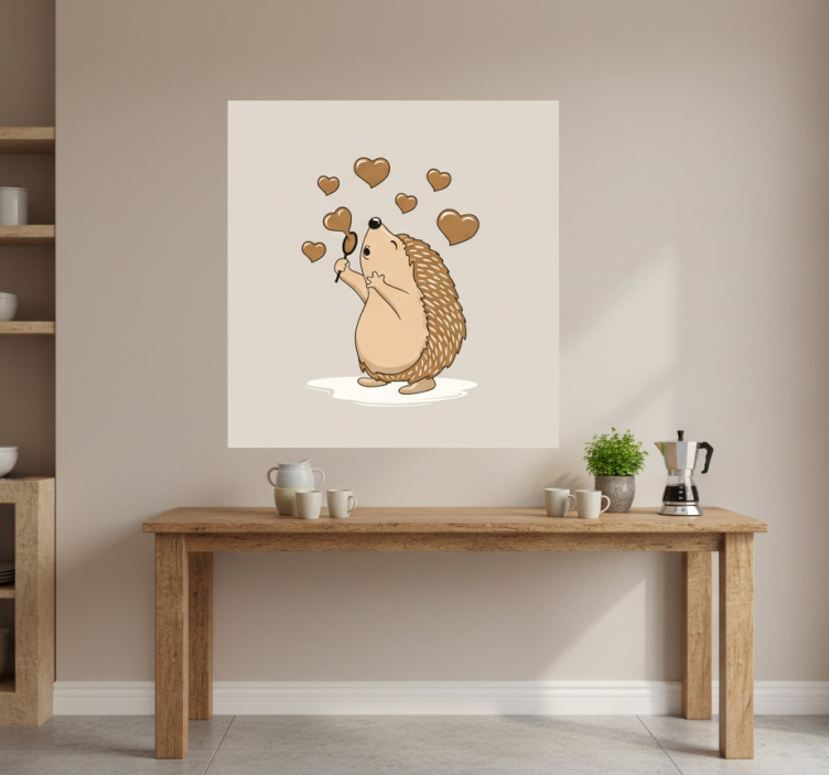この whimsical イラストは、浮かぶハートに囲まれた遊び心満載のアクセサリーを持つかわいいハリネズミを描いています。この魅力的なキャラクターは、温かさと愛情を放ち、さまざまな装飾的な文脈にぴったりな遊び心のあるテーマを完璧に表現しています。柔らかな色合いとシンプルなデザインが、その魅力的な appeal を高め、どんなリビングスペースにもぴったりです。