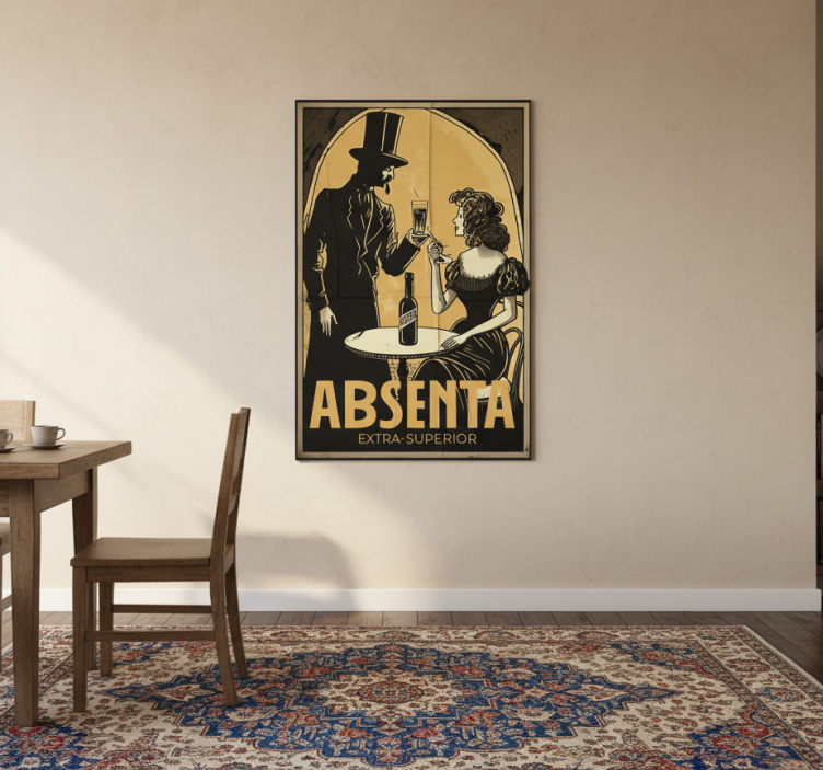 この画像は、'Absenta Extra-Superior'を強調したビンテージスタイルのポスターです。優雅に装ったカップルがテーブルで会話を交わしており、紳士が女性に飲み物を差し出しています。アートデザインはクラシックなエレガンスを強調しており、どんな部屋の装飾にも素晴らしい焦点となります。