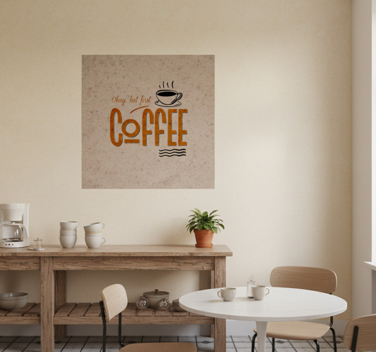 この居心地の良いキッチンのシーンは、「Okay, but first COFFEE.」というフレーズが描かれた魅力的な壁アートを展示しています。温かみのある色合いは木製のテーブルやミニマリストの装飾と調和しています。小さな植物が新鮮さを加え、隣にあるカップやコーヒーメーカーが、コーヒー愛好家にぴったりの心地よい雰囲気を高めています。 ポスター 厨房 レトロな魅力のある文