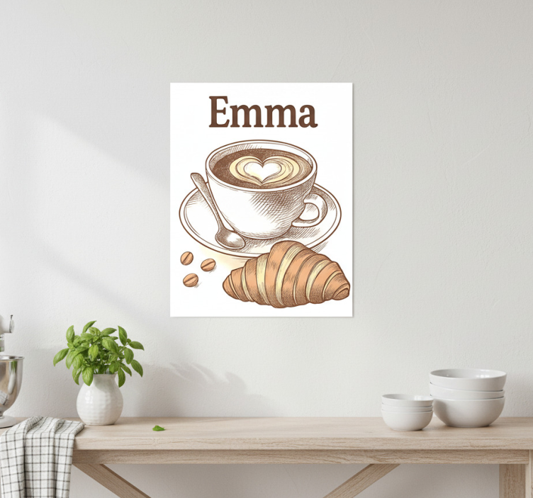 この魅力的なイラストは、ハート型の泡デザインが施された美しく作られたコーヒーカップと、美味しそうなクロワッサンを特徴としています。アートワークには、上に「Emma」という名前が入っており、温かく心地よい雰囲気を醸し出しています。近くにはコーヒー豆が散らばっており、居心地の良い雰囲気を高めています。