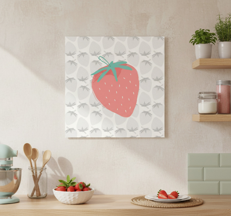 鮮やかなイラストが、パターンの背景にある小さな灰色のイチゴの中に、一つの大きなイチゴを描いています。主な果実は大胆なピンクの色合いと緑の冠を特徴としており、視覚的なコントラストを生み出しています。このデザインは、キッチンの装飾や果物をテーマにしたアートに適した、フレッシュで遊び心のある美学を加えています。