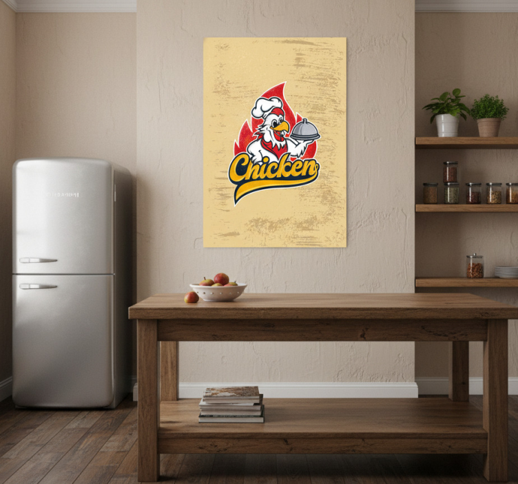 この画像は、ユニークな鶏のシェフのロゴが特徴の活気あるキッチンシーンを展示しています。この遊び心のあるキャラクターは、シェフの帽子をかぶり、ヴィンテージスタイルの背景の下で自信を持って料理を提供しています。鮮やかな色合いと素朴な質感が温かい雰囲気を生み出し、どんな家庭やレストランの設定でも料理のインスピレーションを得るのに理想的です。 ポスター 厨房 ヴィンテージチキンシェフ