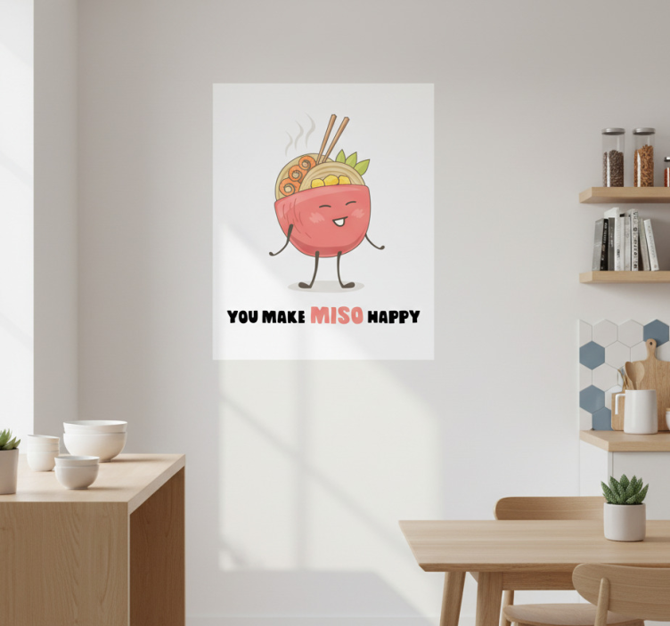 この楽しいイラストには、色とりどりのトッピングとお箸を添えた笑顔の味噌汁が描かれています。遊び心満載のキャラクターは、その明るい表情で喜びを伝えています。下には「YOU MAKE MISO HAPPY」というフレーズが大胆に表示され、楽しい雰囲気を加えています。楽しさと食べ物が見事に融合し、笑顔を誘います。 ポスター 厨房 あなたは私を幸せにしてくれる