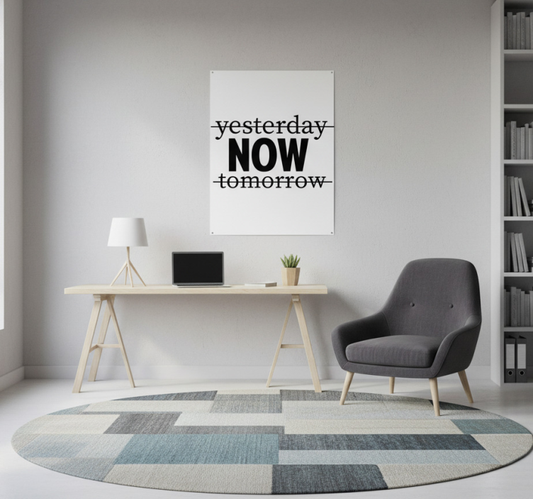 この現代的なワークスペースは、ランプとラップトップが置かれたスタイリッシュでミニマリスティックなデスクが特徴です。印象的な壁アートは「living in the present」という概念を強調し、居心地の良い椅子がリラックスを誘います。円形のラグが温かみとテクスチャーを加え、活気ある部屋の全体的な美学を調和させています。