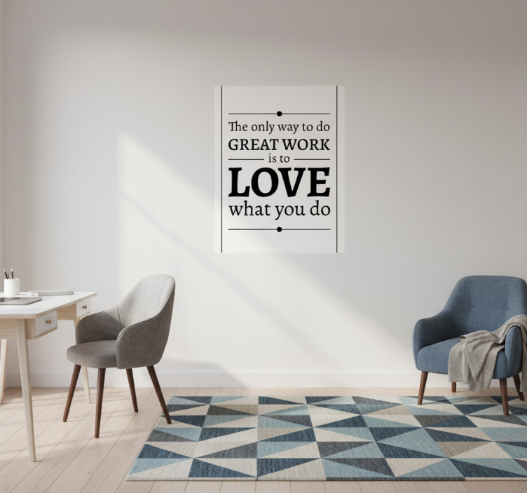 この画像は、仕事における情熱の重要性を強調したインスピレーショナルな壁アート作品を示しています。洗練されたデザインは、白い背景に際立つ黒のタイポグラフィを組み合わせています。現代的なワークスペースに理想的に配置されているこのモチベーショナルな引用は、個人が自分の職業への愛を受け入れ、創造性と充実感を育むことを促しています。