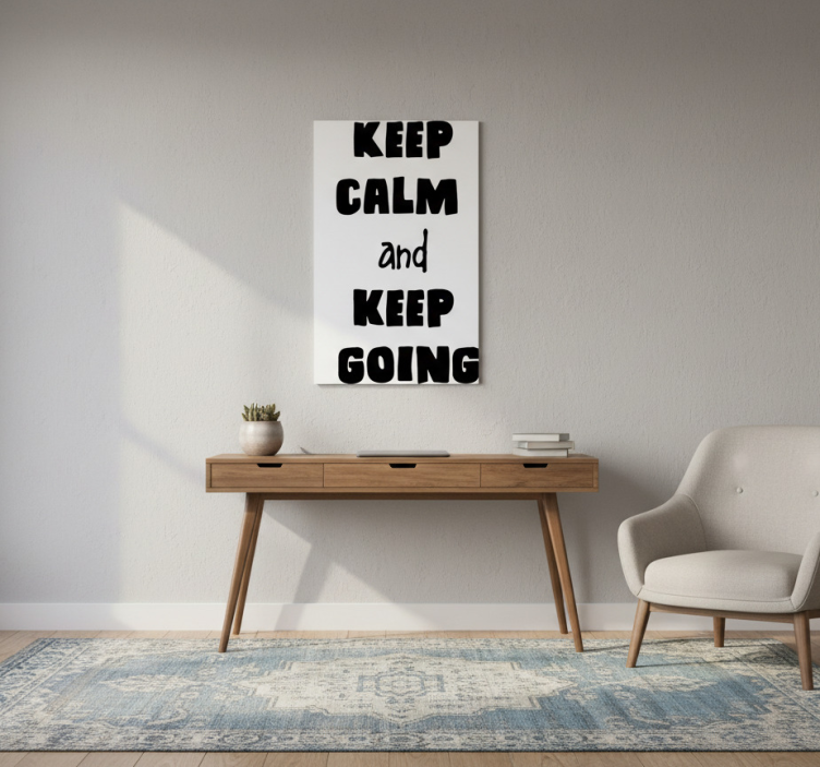 この画像は、現代的な植物と本の束が飾られた木製のデスクを特徴とするスタイリッシュでミニマリストなワークスペースを示しています。壁には「KEEP CALM and KEEP GOING」というモチベーショナルポスターが掛かっており、インスピレーションを与えています。心地よい椅子が穏やかな雰囲気を引き立て、パターンのあるラグが下にテクスチャーを加えています。 ポスター オフィス 落ち着いて前に進もうは、オフィスや自宅の空間をスタイリッシュに彩るための完璧なアイテムです。このポスターは、180g/m2の高品質な紙を使用しており、反射のない半マット仕上げにより、色の鮮やかさが際立ちます。デザインはシンプルでありながらも印象的で、見る人にインスピレーションを与えること間違いなしです。落ち着いたトーンの色合いが、日常の忙しさから解放される瞬間を演出します。