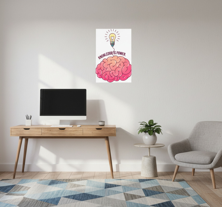 現代的なワークスペースには、コンピュータと文房具が置かれた木製のデスクがあり、心地よい雰囲気を醸し出しています。壁のアートには、脳と電球が組み合わさった鮮やかなイラストが描かれており、知識が力を与えるという概念を表しています。このデザインは、創造性、モチベーション、そして知的成長を強調しています。
