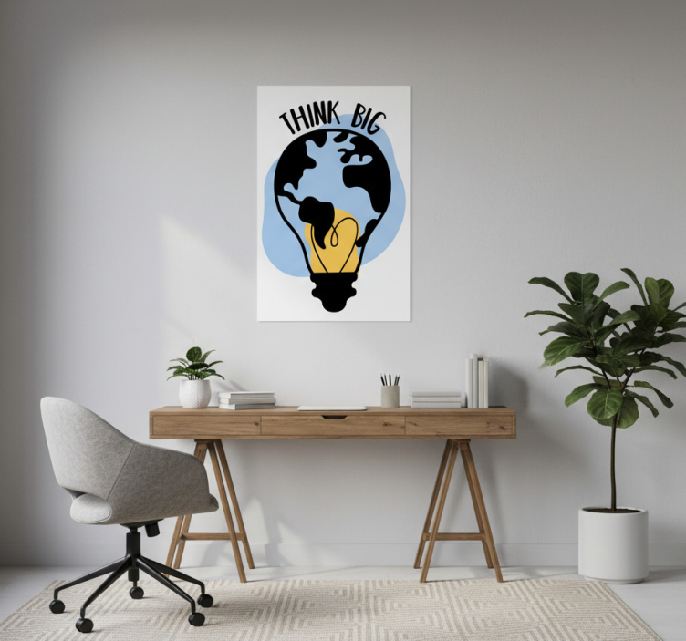 この画像は、地球と絡み合った電球を特徴とする創造的なイラストを示しています。上部の太字のテキストには「THINK BIG」と書かれており、インスピレーションを与えるテーマを強調しています。カラーパレットは柔らかい青、黄色、黒を含み、現代的で考えさせるデザインを伝えています。このアートワークは、モチベーションを高める空間に最適です。