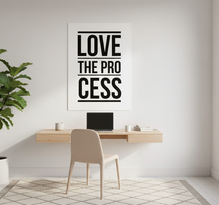 この画像は、ミニマリスティックなデザインの心地よい作業スペースを示しています。木製のデスクには柔らかい椅子が添えられ、快適さを促進しています。「Love The Process」という言葉が書かれた鮮やかなポスターが壁に目立つように掛けられ、創造性と献身を刺激しています。豊かな緑が自然の要素を加え、全体の雰囲気を高めています。