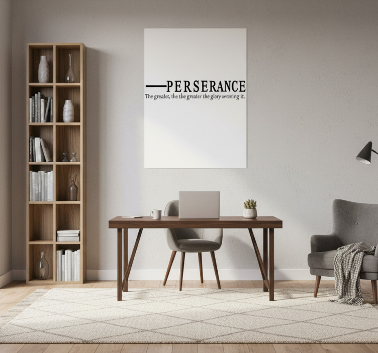 この現代的なワークスペースには、快適な椅子と組み合わされた洗練された木製のデスクがあります。ミニマリストの棚には、装飾品と本が並んでいます。「perseverance」に関するインスピレーショナルな引用が壁を飾り、モチベーションを高めています。柔らかな照明が居心地の良い雰囲気を引き立て、テクスチャーのあるラグがこの魅力的な環境に温かみを加えています。 ポスター オフィス 持続する力