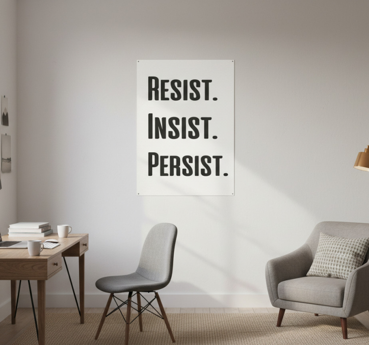 この画像はスタイリッシュなインテリアの設定を特徴としており、太字のタイポグラフィで「Resist. Insist. Persist.」と書かれたモチベーショナルなウォールアートが強調されています。柔らかいカラーパレットが落ち着いた雰囲気を高めており、グレーの椅子と木製のデスクを含む現代的な家具が補完しています。全体のデザインはインスピレーションと決意を促進します。