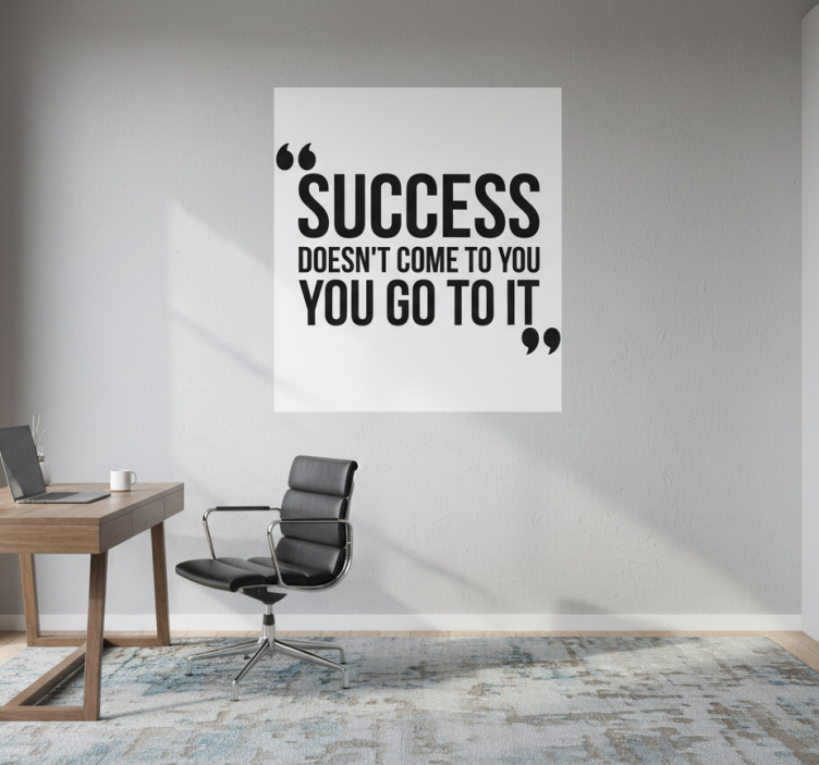 この画像は、達成に向けた積極的なアプローチを強調するモチベーショナルな引用が描かれたミニマリストのワークスペースを示しています。スリムな黒い椅子が木製のデスクを引き立て、デスクの上にはラップトップが置かれており、インスピレーションを与える雰囲気を醸し出しています。ラグが温かみを加え、全体的な美しさを高めています。 ポスター オフィス 成功する素晴らしいデザイン
