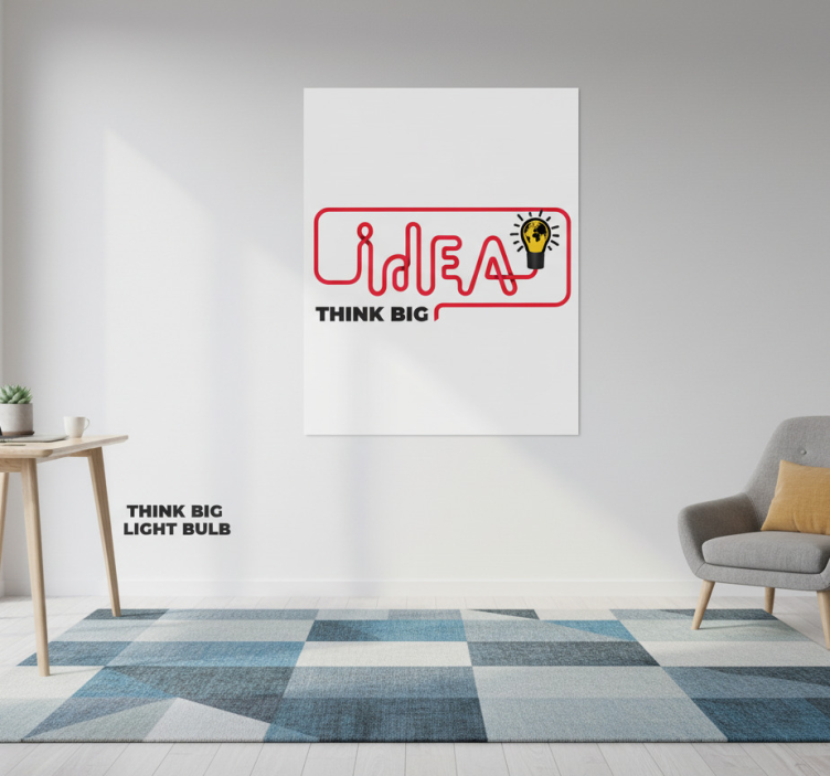 この画像は、明るい赤と黒のタイポグラフィを使用した現代的でスタイリッシュなポスターで、創造性を促進しています。'IDEA'という言葉は独自のデザインで、インスピレーションを象徴する電球を取り入れています。'THINK BIG'というフレーズは、野心と革新を強調しています。現代的な設定がモチベーショナルなテーマを高めており、オフィスやクリエイティブな空間に最適です。 ポスター オフィス 大きな考えの電球