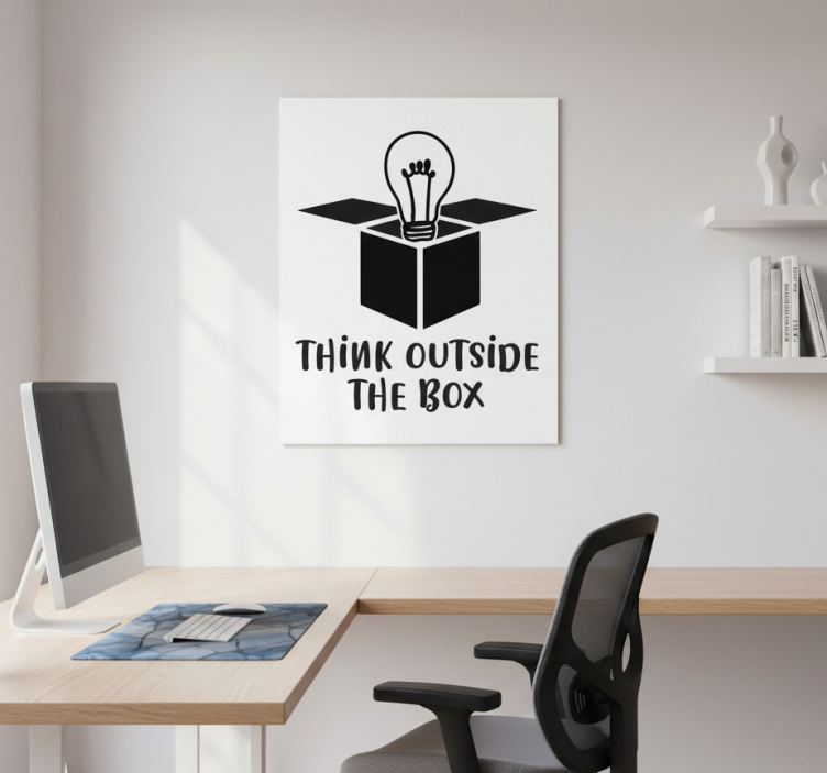 この画像は、開いた箱から光る電球が出ているミニマリストデザインを特徴としています。グラフィックの下には、「THINK OUTSIDE THE BOX」というフレーズが遊び心のあるフォントで目立つように表示されています。このアートワークは創造性と革新性を強調しており、オフィスや個人の作業スペースにぴったりのモチベーションを与える作品です。