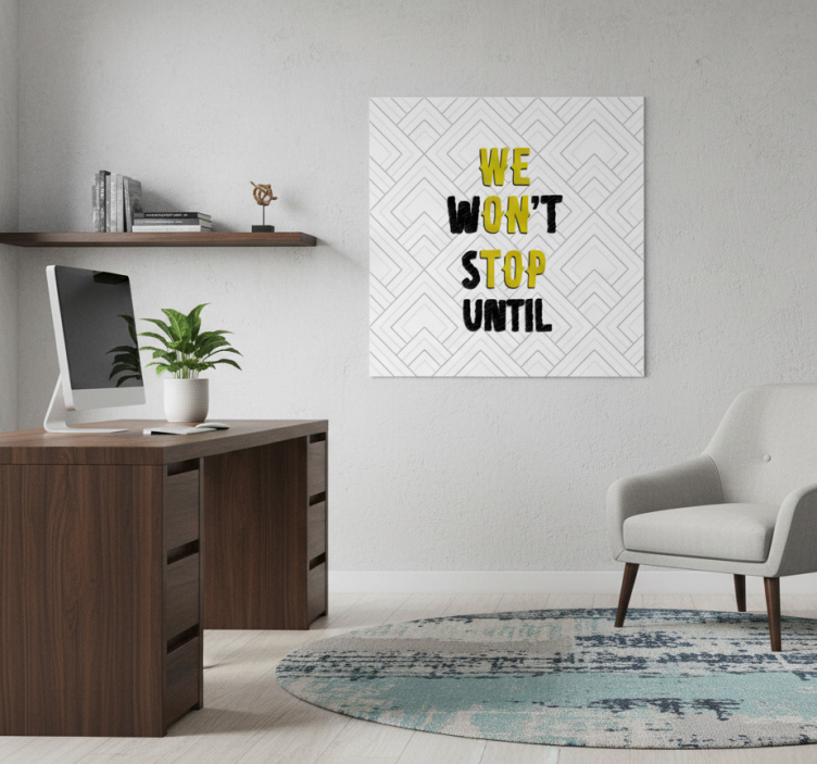 このモダンなワークスペースには、エレガントなコンピュータと鮮やかな緑の植物が飾られたスタイリッシュな木製デスクがあります。快適な明るい色の椅子がパターンのあるラグの隣に置かれ、居心地の良い雰囲気を高めています。壁に掛けられたアートワークには、目を引くタイポグラフィで「WE WON'T STOP UNTIL」というモチベーションのフレーズが表示されています。