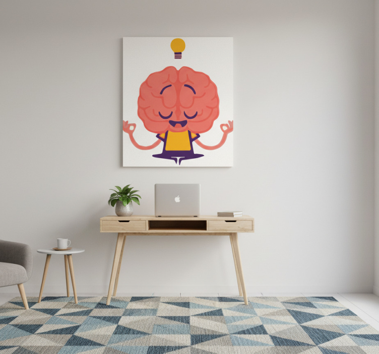 楽しいイラストには、リラックスと創造性を放つカートゥーンの脳が描かれています。中央に位置する脳は、瞑想しながら喜びに満ちた表情をしています。その上には、アイデアやインスピレーションを象徴する light bulb があります。背景には、集中力を高めるクリーンでミニマリスティックな作業スペースが広がっています。この画像は、知性とマインドフルネスの融合を反映しています。