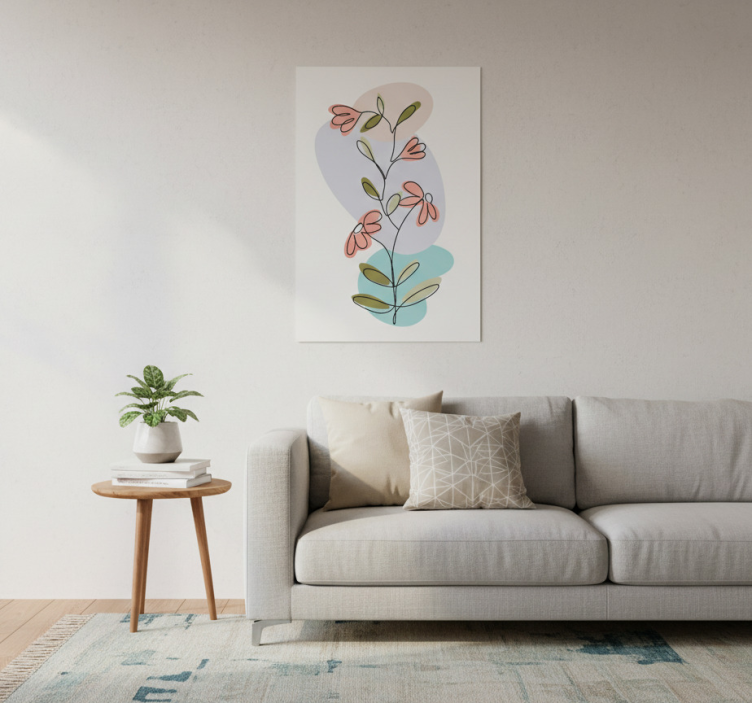 このアートワークは、ピンクの花と緑の葉で特徴づけられた繊細な花のデザインを展示しています。柔らかなパステルの背景に対して配置されており、自然の美しさと現代的なスタイルのバランスが取れています。モダンなリビングスペースを明るくするのに最適で、この作品は優雅さと静けさを反映しており、ホームデコールに魅力的な追加となります。