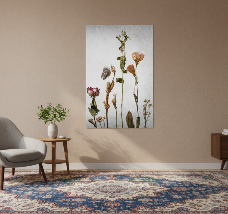 この画像は、テクスチャーのあるニュートラルな背景に対して、乾燥した花々がアーティスティックに配置されている様子を示しています。さまざまな植物要素が、繊細なディテールと muted colors を持ち、魅力的なビジュアルを作り出しています。この構成は、ノスタルジアと自然の美しさを呼び起こし、インテリアデコレーションを引き立てるのにぴったりです。