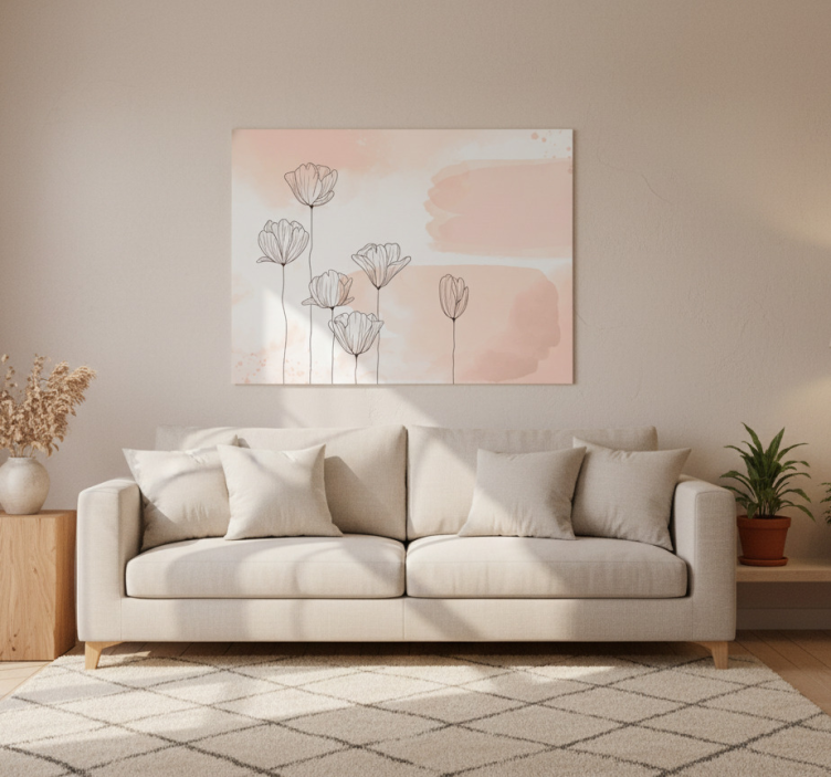 この画像は、柔らかいトーンのソファにふわふわのクッションが置かれた穏やかなリビングスペースを特徴としています。その後ろには、穏やかなパステルの背景に繊細な線画の花が描かれたミニマリストのフローラルアートが掛かっています。鉢植えの植物と装飾的な花瓶が自然の要素を加え、部屋の穏やかな雰囲気を高めています。 植物 ポスター フローレスラインは、洗練されたデザインと美しい色合いを兼ね備えた素晴らしいアート作品です。このポスターは、視覚的なインパクトを提供し、お部屋に自然のエッセンスを取り入れるための完璧な選択です。180g/m2の紙厚に加え、反射のない半マット仕上げにより、色の鮮やかさが際立ち、どんなインテリアとも調和します。植物の美しさを引き立てるこのポスターは、あなたの空間に新たな生命を吹き込むことでしょう!