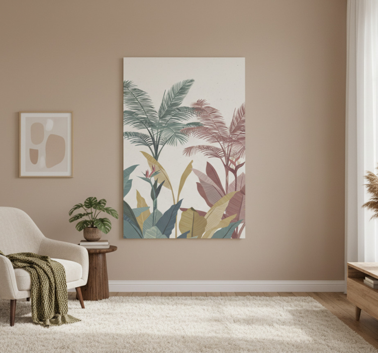 この静かなリビングスペースには、穏やかな色合いの豊かなスタイライズされた葉を描いた大きなアートワークがあります。快適な椅子には編まれたブランケットが掛けられ、木製のサイドテーブルの隣に置かれていて、居心地の良いスポットを提供しています。鉢植えの植物が自然なアクセントを加え、部屋の穏やかな雰囲気を高めています。