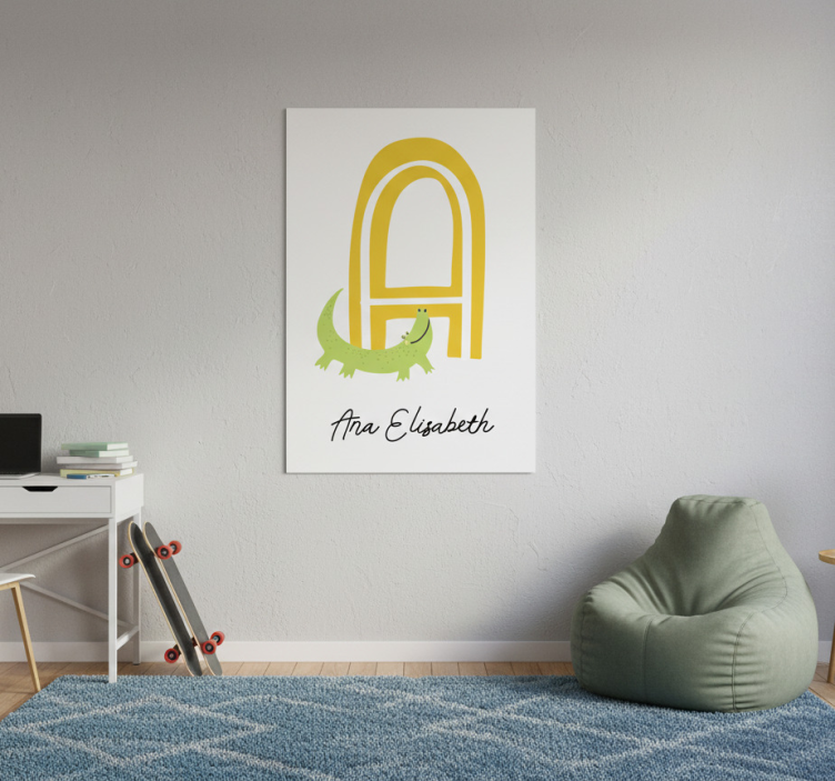 この陽気なイラストは、大きな黄色の「A」とその下に遊び心満載の緑のワニが描かれています。「Ana Elisabeth」という名前はスタイリッシュなフォントでエレガントに書かれており、 whimsicalなテーマを引き立てています。全体のデザインは、子供部屋の鮮やかな装飾にぴったりな、楽しく子供に優しい雰囲気を放っています。 ポスター ユースルーム ワニの仲間
