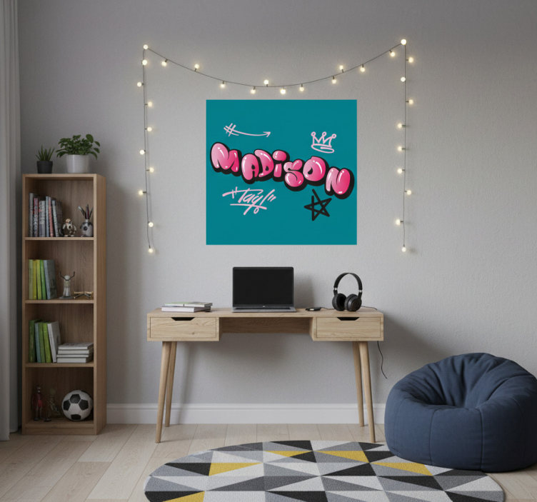 この画像は、鮮やかな青い壁にピンク色の色合いで「Madison」という名前のグラフィティアートが描かれたスタイリッシュな部屋を示しています。現代的なデスクにはコンピュータが置かれ、その隣には居心地の良いビーンバッグチェアがあります。きらめくフェアリーライトが魅力的な雰囲気を加え、装飾的な本棚がそれを引き立てています。 ポスター ユースルーム クリエイティブネームデザイン